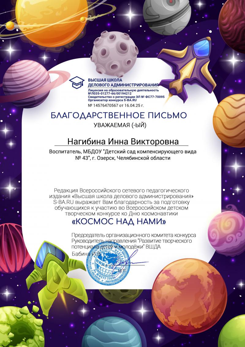 Благодарственное письмо редакции Всероссийского сетевого педагогического издания "Высшая школа делового администратирования" S-BA.RU за подготовку обучающегося к участию во Всероссийском детском конкурсе рисунков "Космос над нами""